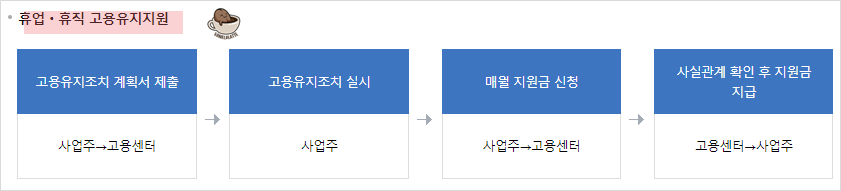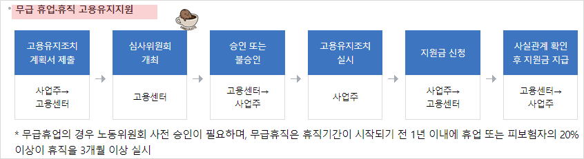 - 휴직 지원금: 사업주가 근로자에게 1개월 이상 유급 휴직을 부여하고 휴직수당을 지급시, 휴직수당의 일부를 지원